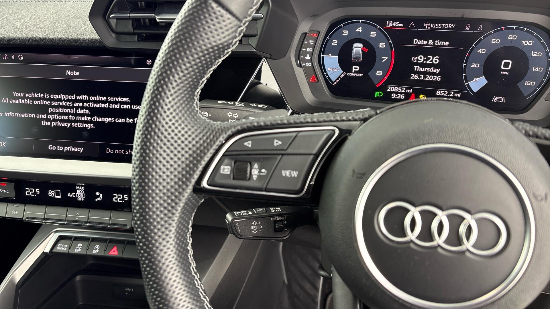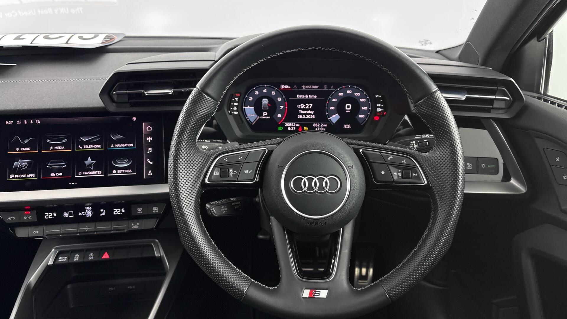 This 2023 Audi A3 TFSI S line presents an exceptional ownership proposition, boasting a full dealership service history from its sole owner. This Euro 6 compliant model is equipped with a responsive 1.0 litre petrol engine and features striking 18 inch 5-Y-spoke style alloy wheels in diamond cut graphite grey. For convenience and comfort, it includes a Bluetooth interface, LED headlights with dynamic rear indicators, dual zone electronic climate control, and rear parking sensors.